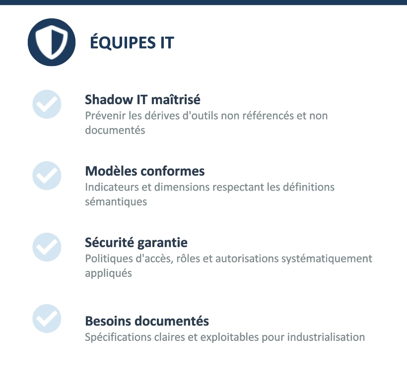 De l’autre côté, les équipes IT portent une responsabilité tout aussi critique : garantir la sécurité des données, la fiabilité des modèles, le respect des politiques d’accès et la cohérence sémantique des indicateurs. Chaque outil non maîtrisé déployé par un utilisateur métier — le fameux shadow IT — représente un risque : données non fiables, failles de sécurité, perte de traçabilité.