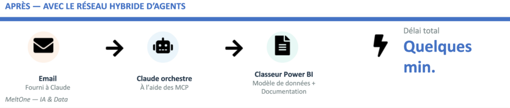 Après, avec un réseau hybride d’agents : le même workflow en quelques minutes et en autonomie