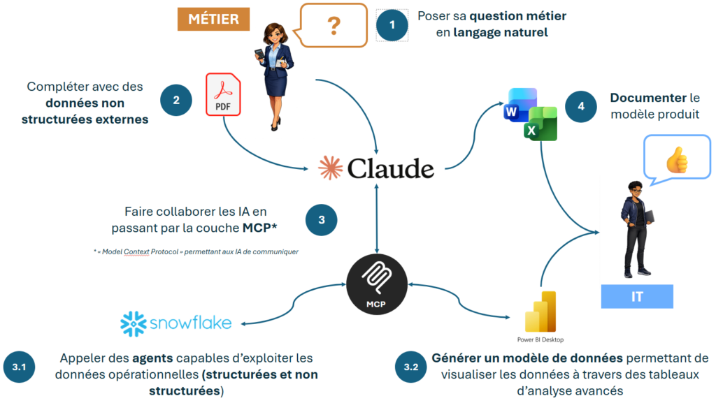 Le protocole MCP (Model Context Protocol) est la clé de voûte technique de cette architecture. Il permet à Claude de se connecter de manière standardisée et sécurisée à différents outils — ici Snowflake et Power BI — sans développement d’intégration spécifique. C’est ce qui rend le workflow fluide et reproductible.